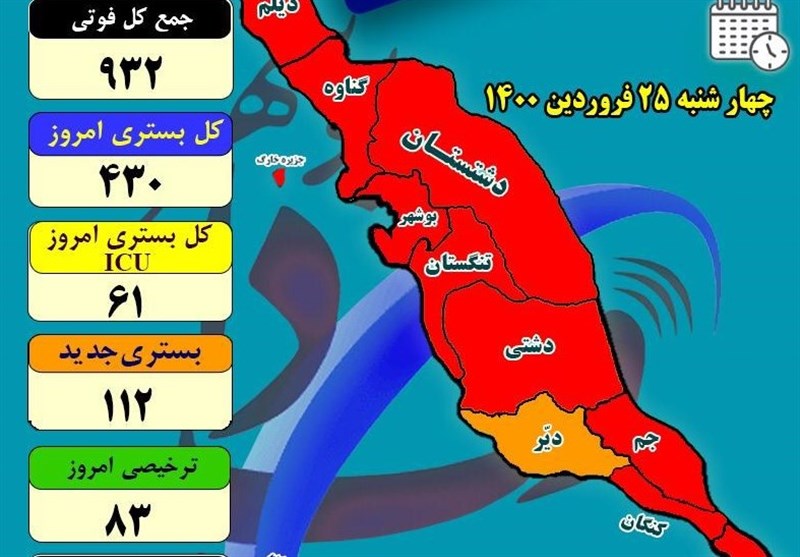 دبیر ستاد مقابله با کرونا استان بوشهر با اشاره به اینکه 9 شهرستان 10 گانه استان بوشهر در شرایط قرمز قرار دارند اظهار داشت: تعداد مبتلایان به کرونا هر روز نسبت به روز قبل افزایش دارد به گونه‌ای که تعداد بستری‌ها در بخش کرونایی بیمارستان‌ها امروز به 430 نفر رسید.