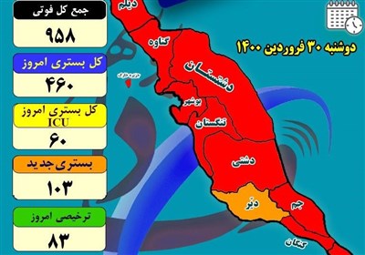 وی، تعداد موارد مبتلا و بستری در استان بوشهر افزایشی دانست و افزود: در 2 روز گذشته 14 نفر در بخش کرونایی بیمارستانهای استان بوشهر فوت کردهاند و اکنون مجموع فوتیهای استان بوشهر به 958 نفر رسیده است.