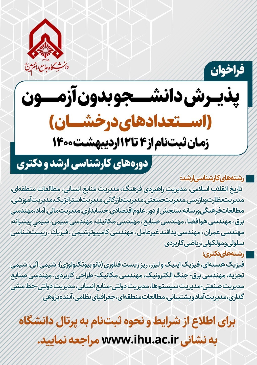 جهت کسب اطلاعات در خصوص شرایط و نحوه ثبتنام به فراخوان پذیرش بدون آزمون دوره دکتری و دوره کارشناسی ارشد دانشگاه جامع امام حسین علیه السلام برای سال تحصیلی 1401-1400 اینجا و اینجا را کلیک کنید.