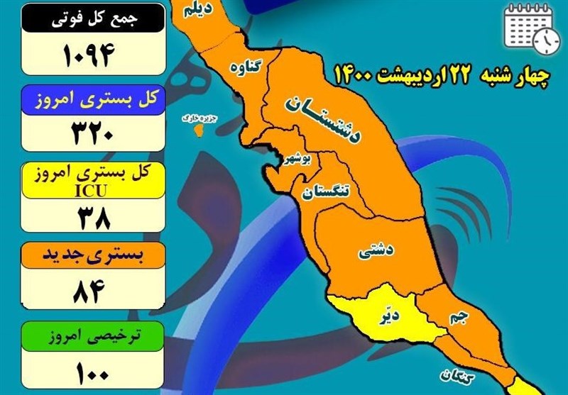 دبیر ستاد مقابله با کرونا استان بوشهر با پرهیز از مسافرت، دورهمی خانوادگی و تجمعات گفت: شهرستانهای 10 گانه استان بوشهر 80 درصد آن در وضعیت نارنجی و 20 درصد در شرایط زرد قرار دارند.