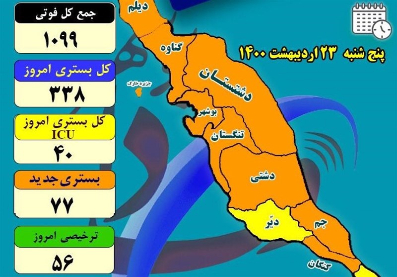 رئیس دانشگاه علوم پزشکی بوشهر، با اشاره به اینکه در شبانهروز گذشته 77 نفر در بخش کرونایی بیمارستانهای استان بوشهر بستری شدهاند خاطر نشان کرد: در شبانهروز گذشته 77 بیمار جدید با علائم کرونا در بیمارستانهای استان بستری و 56 نفر هم ترخیص شدند.