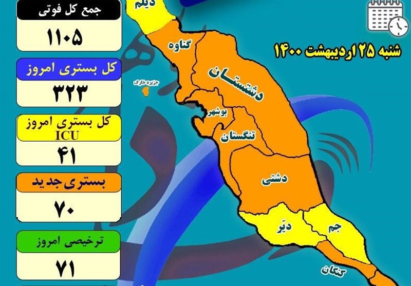 رئیس دانشگاه علوم پزشکی بوشهر، به تغییر رنگبندی در شهرستانهای 10 گانه استان پرداخت و افزود: طبق رنگبندی جدید از امروز شهرستان دیلم و جم از وضعیت نارنجی به زرد و شهرستان عسلویه از زرد به نارنجی تغییر وضعیت داد و اکنون 3 شهرستان دیلم، جم و دیر در شرایط زرد و 7 شهرستان بوشهر، دشتستان، گناوه، تنگستان، دشتی، کنگان و عسلویه نارنجی هستند.