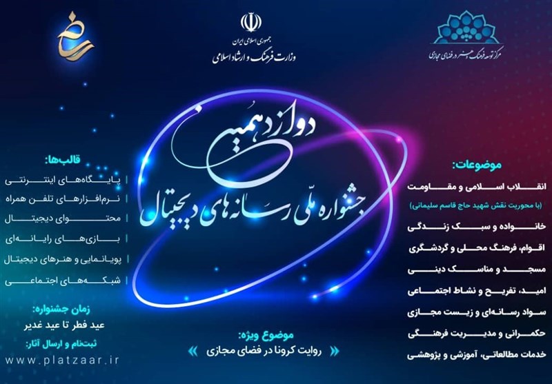 آقای امیرنیا اضافه کرد: تمامی فرآیندهای جشنواره دوازدهم اعم از ثبتنام، دریافت آثار، داوری و انتخاب برگزیدگان به صورت مجازی و بر بستر سامانه پلتزار (شبکه تعاملی و توانمندسازی فعالان کسب و کارهای دیجیتال) انجام خواهد شد و صاحبان بسترهای تولید و نشر، نرمافزارهای تلفن همراه، بازیهای رایانهای و محتواهای دیجیتال میتوانند با مراجعه به سامانه www.platzaar.ir در این جشنواره شرکت کنند.