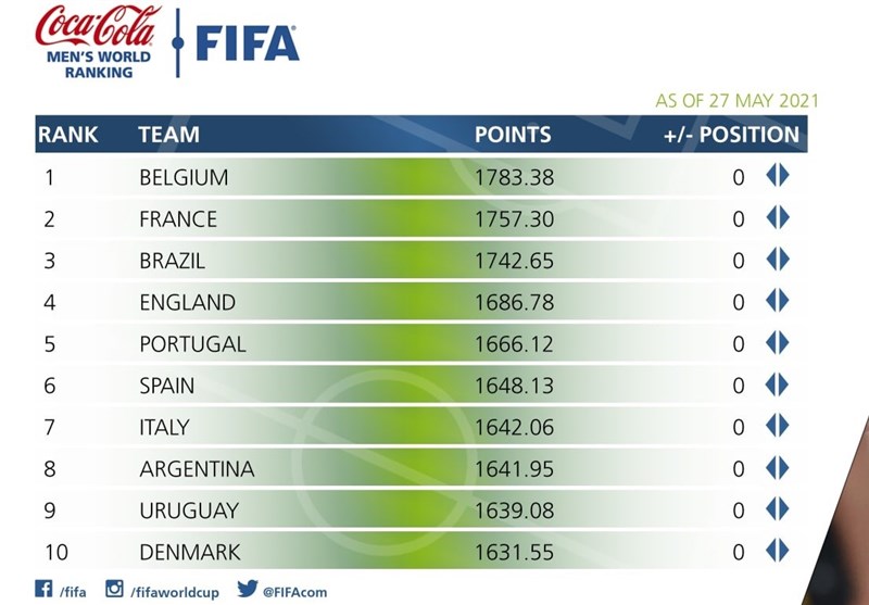 به این ترتیب تیمهای ملی بلژیک، فرانسه، برزیل، انگلیس، پرتغال، اسپانیا، ایتالیا، آرژانتین، اوروگوئه و دانمارک، رتبه ماه گذشته خود را حفظ کردهاند و در جایگاههای اول تا دهم این ردهبندی ایستادهاند.