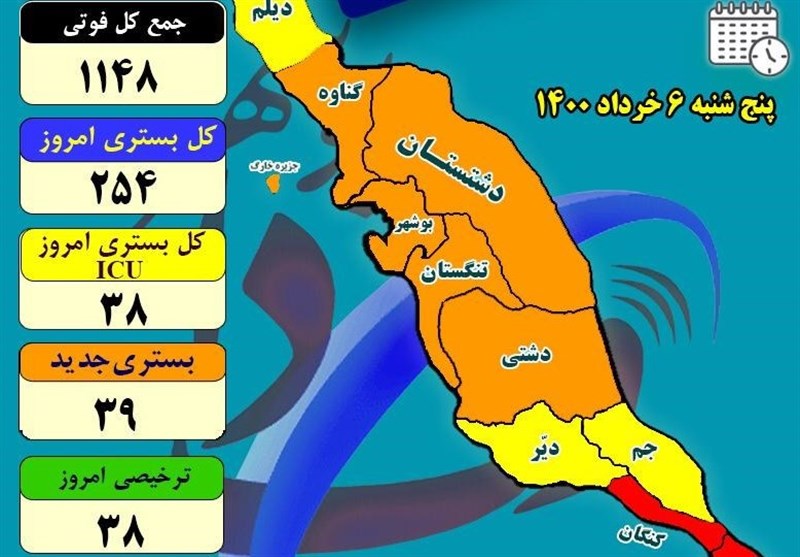 سعید کشمیری در گفتوگو با خبرنگار تسنیم در بوشهر، با بیان اینکه 2 شهرستان عسلویه و کنگان در وضعیت قرمز قرار دارند اظهار داشت: شهرستانهای بوشهر، دشتستان، دشتی، تنگستان و گناوه در وضعیت نارنجی و شهرستانهای جم، دیلم و دیر در وضعیت زرد قرار دارند.