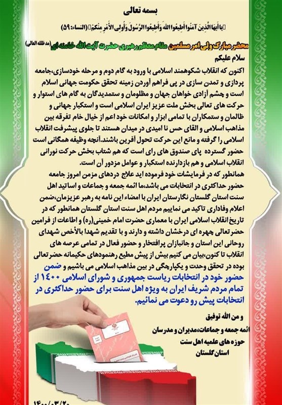 علمای اهلسنت و ائمه جمعه و جماعات استان گلستان با اشاره به فرمایش رهبر انقلاب مبنی بر اینکه علاج دردهای مزمن جامعه حضور حداکثری در انتخابات است، افزودند: مردم اهلسنت استان گلستان همانطور که در تاریخ انقلاب اسلامی ایران با معماری حضرت امام خمینی(ره) و پیروی از فرامین حضرتعالی چهرهای درخشان داشته و دارند و با تقدیم شهدا بالاخص شهدای روحانی این استان و جانبازان پرافتخار و حضور فعال در تمامی عرصههای انقلاب تاکنون، بیان میکنیم بیش از پیش مطیع رهنمودهای حکیمانه حضرتعالی بوده و در تحقق وحدت و یکپارچگی در بین مذاهب اسلامی هستیم و ضمن حضور خود در انتخابات ریاستجمهوری و شورای اسلامی 1400 از تمام مردم شریف ایران بهویژه اهلسنت برای حضور حداکثری در انتخابات پیشِرو دعوت مینماییم.