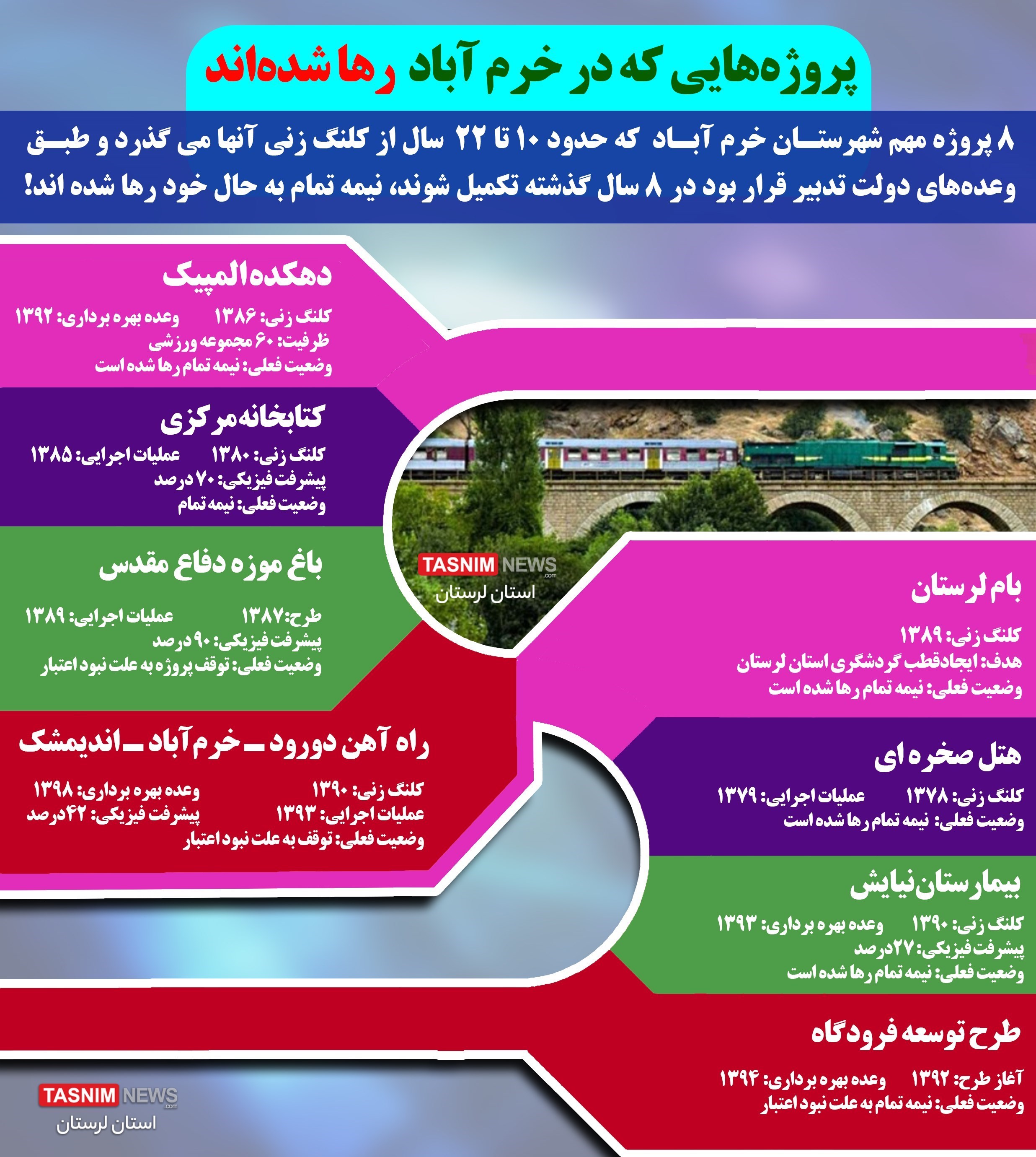 وعده‌های 8 ساله دولت تدبیر در لرستان- 2 | "8 پروژه‌ای" که در خرم‌آباد رها شده‌اند؛ از دهکده المپیک تا راه آهن + اینفوگرافیک