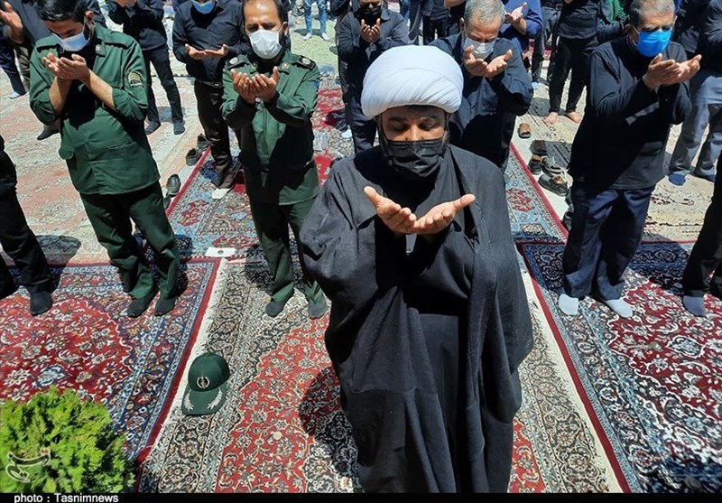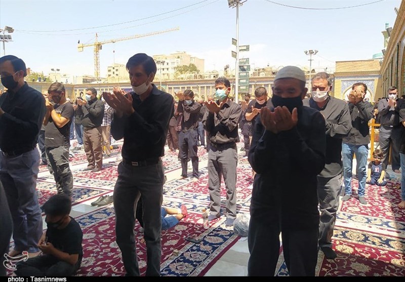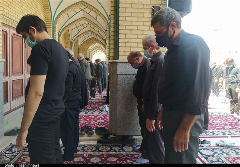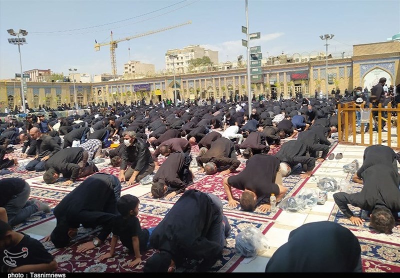 عاشقان خاندان عصمت و طهارت نماز ظهر عاشورا به یاد آخرین نماز سالار شهیدان سیدالشهدا (علیهالسلام) با رعایت اصول بهداشتی در فضای باز اقامه کردند.