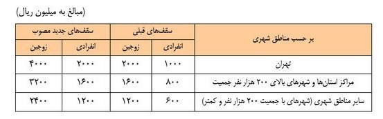 سقف تسهیلات ساخت و خرید مسکن از محل اوراق گواهی حق تقدم استفاده از تسهیلات مسکن در تهران برای زوجین 400 میلیون تومان و بهصورت انفرادی 200 میلیون تومان، در مراکز استانها و شهرهای بالای 200 هزار نفر جمعیت برای زوجین 320 میلیون تومان و به صورت انفرادی 160 میلیون تومان و در سایر مناطق شهری با جمعیت 200 هزار نفر و کمتر برای زوجین 240 میلیون تومان و بصورت انفرادی 120 میلیون تومان تعیین شد.