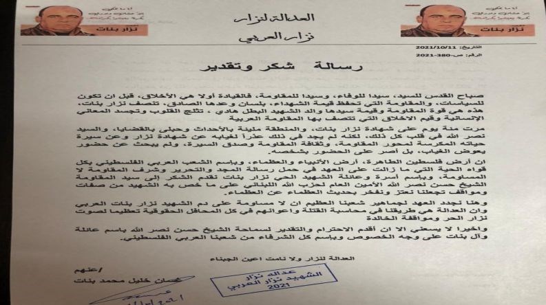 این پیام تشکر خانواده شهید فلسطینی بعد از آن ارسال شد که سید حسن نصرالله در سخنرانی شب گذشته خود به شخصیت نزار بنات پرداخته و از او یاد کرد.