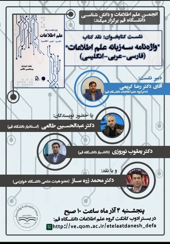 به گزارش خبرنگار فرهنگی خبرگزاری تسنیم، نشست برخط نقد و بررسی کتاب "واژهنامه سه زبانه علم اطلاعات" تألیف عبدالحسین طالعی و یعقوب نوروزی، روز پنجشنبه (4 آذرماه جاری) برگزار شد.