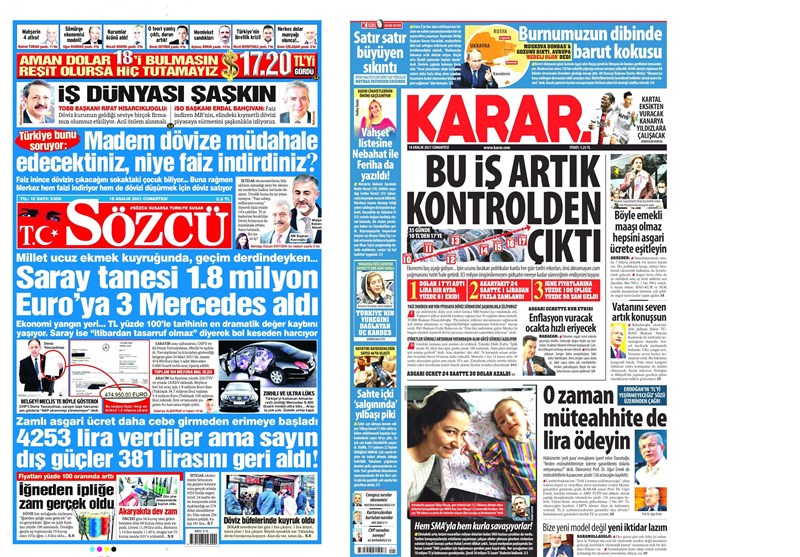 به گزارش گروه بینالملل خبرگزاری تسنیم، بسیاری از روزنامههای ترکیه، امروز در عکس و تیتر صفحه نخست، بحران اقتصادی را برجسته کردهاند.