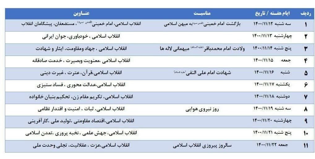 رئیس ستاد دهه فجر انقلاب اسلامی خراسان جنوبی در ادامه شعار محوری و سراسری دهـه فجـر انـقلاب اسـلامی را جشـن ملی 1400 بیان و عنـاوین ایـام الله دهه فجر انقلاب اسلامی 1400 را بدین شرح اعلام کرد: