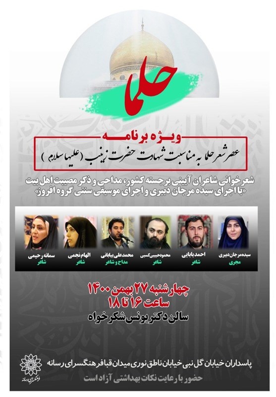 براساس این گزارش، عصر شعر «حلما» چهارشنبه 27 بهمن ماه از ساعت 16 مقارن با شب وفات حضرت زینب در فرهنگسرای رسانه برگزار میشود. حضور برای عموم با رعایت دستورالعملهای بهداشتی بلامانع است.