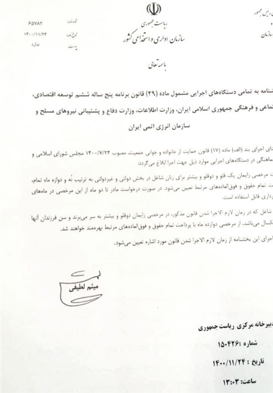 لازم به توضیح است که این بخشنامه به امضای میثم لطیفی، معاون رییس جمهور و رییس سازمان اداری و استخدامی کشور، رسیده است.