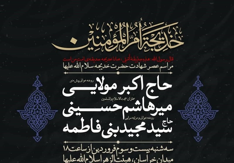 در این مراسم، حجت الاسلام میرهاشم حسینی سخنرانی خواهد داشت و درباره فضائل حضرت خدیجه سخن میگوید، همچنین حاج اکبر مولایی روضهخوانی پیشمنبر دارد و سیدمجید بنیفاطمه مرثیهسرایی و ذکر مصیبت میکند.