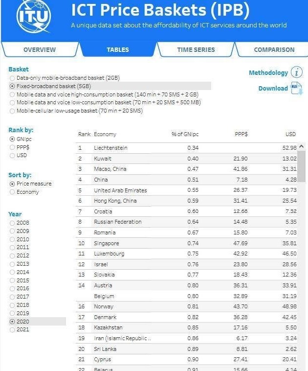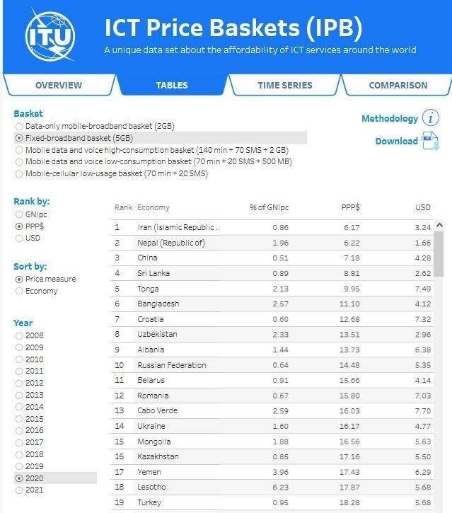 آمار رسمی ITU بر اساس نرخ مطلق به دلار و شاخص درصد از درآمد سرانه GNIpc و شاخص قیمت نسبی برابری قدرت خرید PPP$ اعلام شده که قیمت اینترنت ثابت با حجم 5 گیگابایت سهمیه FUP (مصرف کاربران) مورد مقایسه قرار گرفته است.