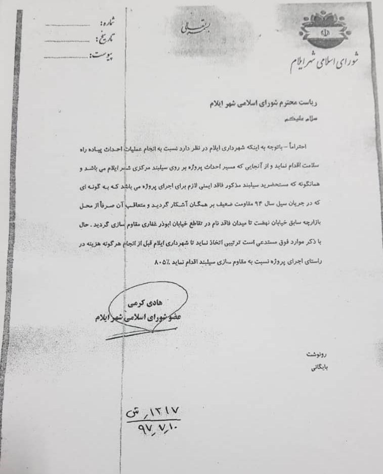 هادی کرمی عضو شورای شهر پنجم و نایب رئیس شورای ششم نیزبه باز نشر نامه انتقادی خود و مخالفت با انجام پروژه بلوار به روی سیلبند (مسیل)مرکزی شهر ایلام اقدام کرده است که متن و سند آن در این گزارش ارائه میشود.