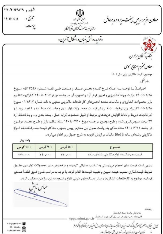 در این ابلاغیه آمده است؛ "با توجه به اعلام نرخ گندم بخش صنف و صنعت وزارت جهاد کشاورزی و تعیین نرخ آرد و تصویب آن در جلسه ششم اردیبهشت ماه 1401 کارگروه تنظیم بازار محصولات کشاورزی و مکاتبات متعدد انجمنهای کارخانهجات ماکارونی پیرامون درخواست افزایش قیمت محصولات تولیدی و جلسات منعقده با انجمنها و کارخانهجات ذیربط و لحاظ افزایش هزینههای مرتبط از قبیل دستمزد، کرایههای حملونقل و بستهبندی و با لحاظ آرد 27 درصد سبوسگیریشده قیمتهای جدید ماکارونی اعلام شد".