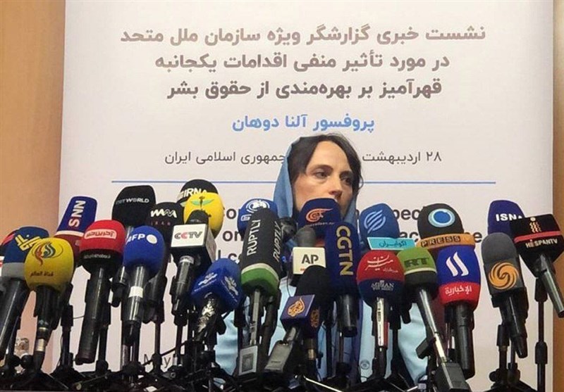 به گزارش خبرنگار سیاسی خبرگزاری تسنیم، النا دوهان گزارشگر ویژه سازمان ملل متحد درباره تأثیر منفی اقدامات یکجانبه قهرآمیز بر بهرهمندی از حقوق بشر، عصر امروز (چهارشنبه 27 اردیبهشت) در یک نشست خبری به تشریح نتایج سفر 12روزه خود به ایران و دیدارهای انجامشده با مسئولان و سازمانهای مختلف پرداخت.