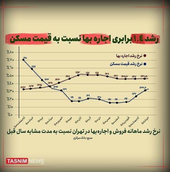 به گزارش خبرگزاری تسنیم، آمار بانک مرکزی نشان میدهد در یکسال گذشته نرخ رشد قیمت اجارهبها برای نخستین بار در چند سال اخیر از نرخ رشد قیمت فروش مسکن در تهران پیشی گرفته است.