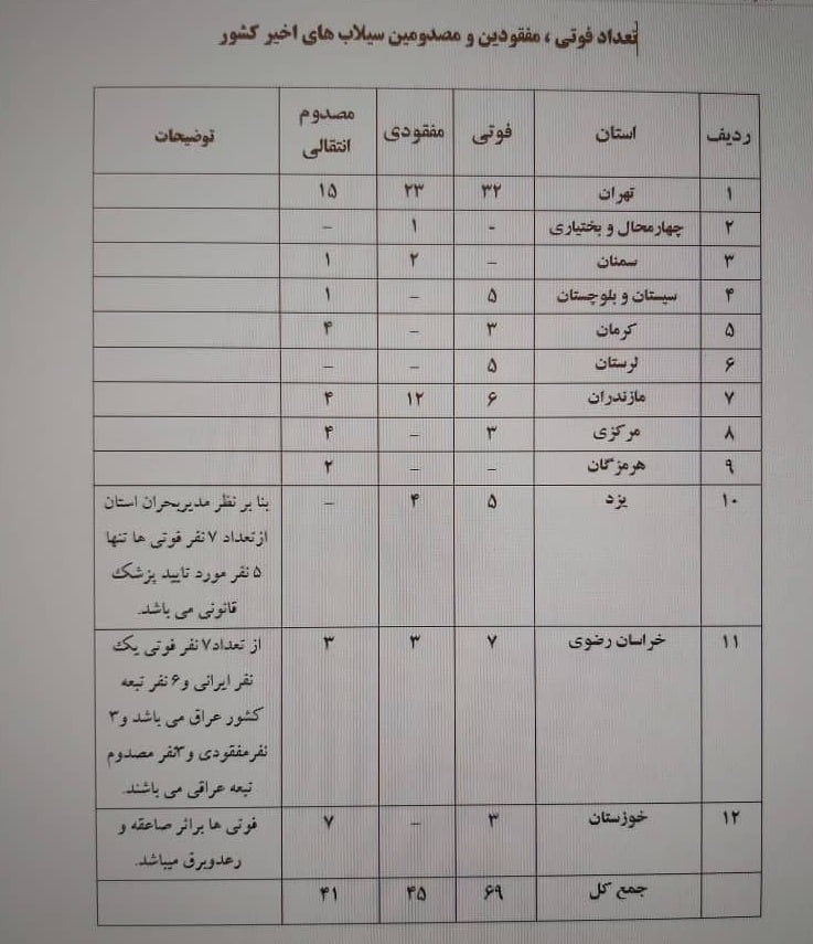 وی با بیان اینکه از میان 69 نفر فوتی شش نفر تبعه کشور عراق هستند، گفت: همچنین طبق آخرین آمارها 45 نفر مفقودند که سه نفرشان تبعه عراقی هستند و تلاش برای یافتن این افراد از سوی امدادگران هلال احمر، آتشنشانی و ... در حال انجام است.