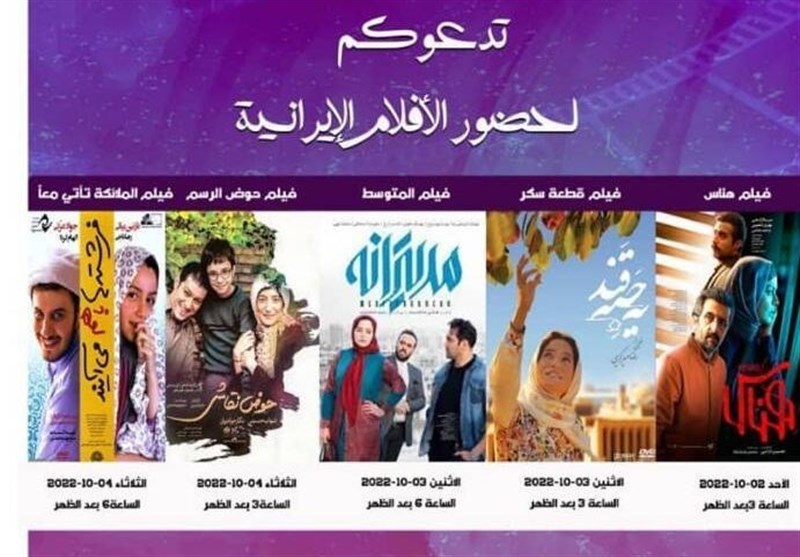 در این رویداد فرهنگی و هنری که تا روز سه شنبه 12 مهرماه ادامه دارد؛ فیلم‌های «هناس»، «مدیترانه»، «حوض نقاشی»، «یه حبه قند» و «فرشته‌ها با هم می آیند» با زیرنویس عربی به نمایش در می‌آید.