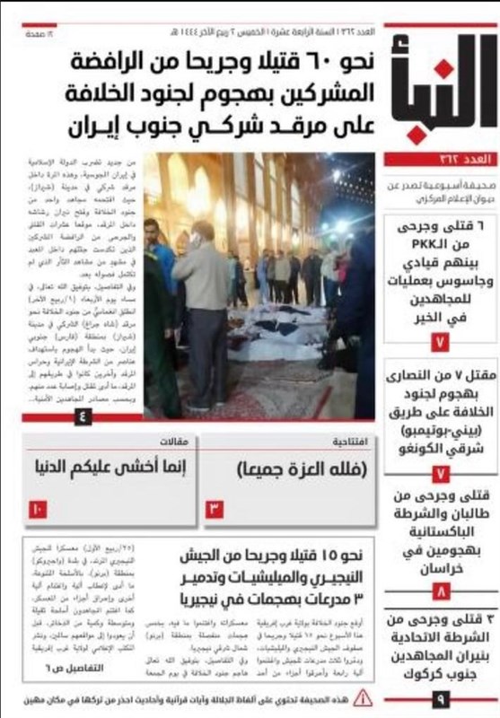 ـ داعش میدان نبرد را گستردهتر از میدان جنگی دانسته و از #رسانه بهعنوان میدان نبردی که مجاهدین رسانهای علیه دشمن میجنگند، تعریف کرده است. النبأ ارگان رسمی و از معدود بازماندههای رسانههای متعدد داعش در سالهای بعد از فروپاشی خلافت دولت اسلامی است.