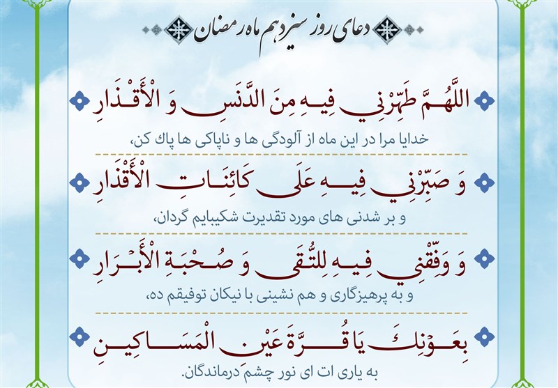 به گزارش خبرنگار فرهنگی خبرگزاری تسنیم، حضرت پیامبر اکرم(ص) برای هر روز از ماه رمضان دعایی ذکر فرمودهاند و دعای روز سیزدهم این ماه مبارک بهشرح زیر است: