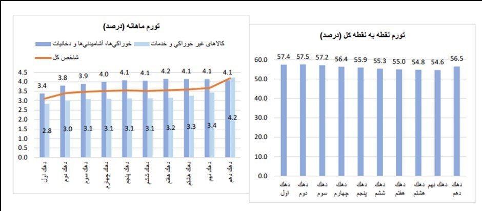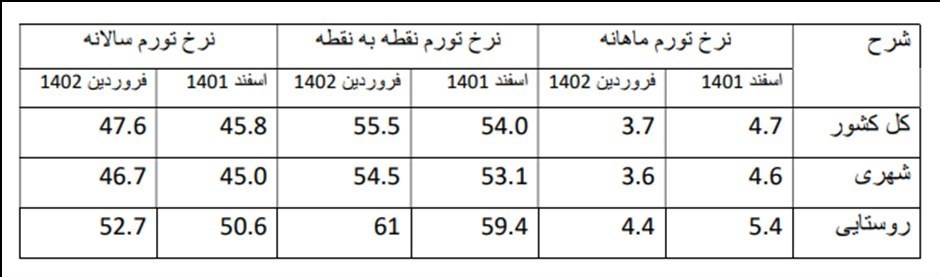 بر اساس این گزارش اعداد نرخ تورم ماهانه، سالانه و نقطه به نقطه به تفکیک مناطق شهری، روستایی و کل کشور به صورت جدول زیر می باشد: