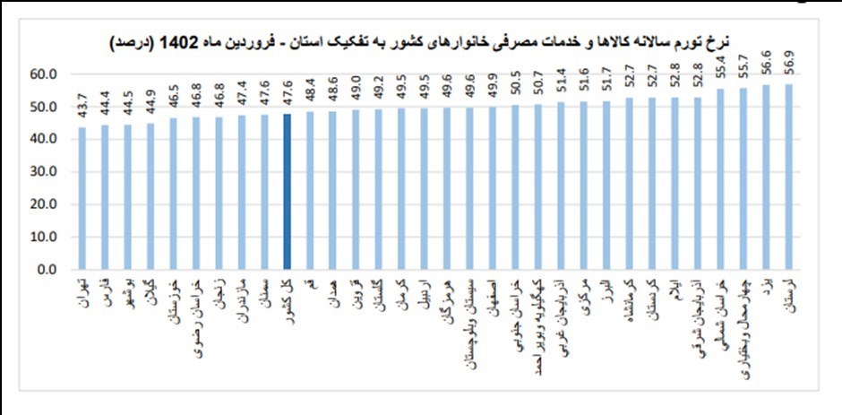 بیشترین نرخ تورم سالانه در فروردین ماه 1402 مربوط به استان لرستان با عدد 56,9 و کمترین مربوط به استان تهران با عدد 43.7 می باشد. نرخ تورم سالانه فروردین 1402 به تفکیک استانهای کشور به صورت نمودار زیر می باشد: