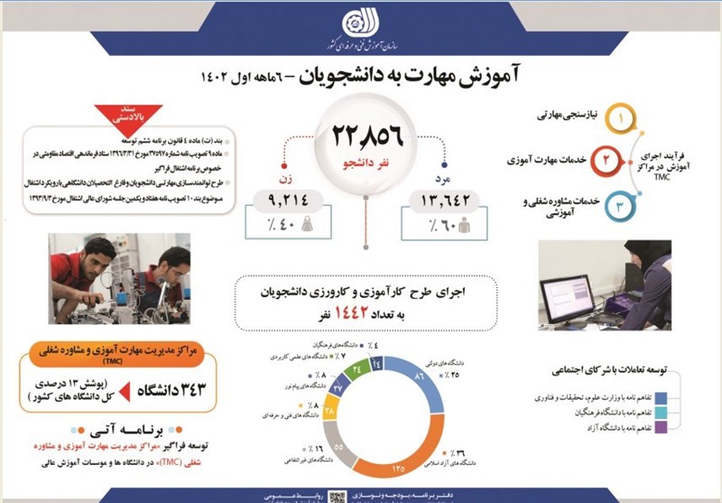 گزارش های سازمان فنی و حرفه ای حاکی از این است که در شش ماهه نخست امسال، 22هزار و 856نفر از دانشجویان، دورههای آموزش مهارتی را گذراندند که 13هزار و 642نفر از آنها مرد و 9214نفر زن هستند.60درصد دانشجویان مهارتآموز را مردان و 40درصد را زنان تشکیل میدهند.