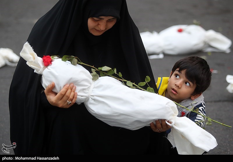 به یاد کودکان مظلوم غزه پیکرهای نمادین کفن پوش شدهای داخل میدان فلسطین قرار داده شد.