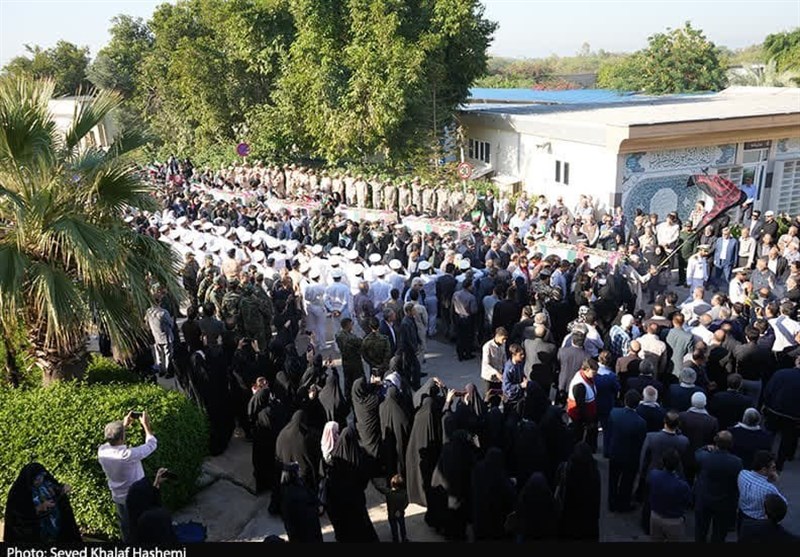 در این آیین که نماینده ولی فقیه در استان، امام جمعه، استاندار، فرماندهان نیروهای مسلح، خانواده معظم شهدا، دانشآموزان، دانشجویان و کارکنان ادارات حضور داشتند با شعار این گل پر پر از کجا آمده از سفر کربوبلا آمده، مرگ بر آمریکا، مرگ بر اسرائیل پیکر این 5 شهید را تشییع کردند.