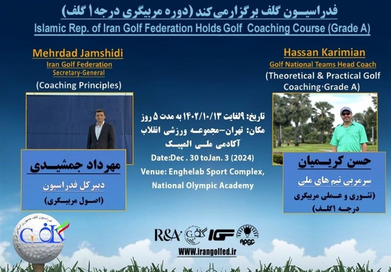 به گزارش خبرگزاری تسنیم و به نقل از روابط عمومی فدراسیون گلف، اولین دوره سراسری (کشوری) مربیگری درجه یک گلف (تئوری و عملی) توسط فدراسیون گلف از تاریخ 9 لغایت 13 دی ماه سال جاری با تدریس مهرداد جمشیدی؛ دبیرکل فدراسیون گلف و حسن کریمیان سرمربی تیم‌های ملی گلف در محل زمین گلف مجموعه ورزشی انقلاب تهران و آکادمی ملی المپیک برگزار می‌شود.