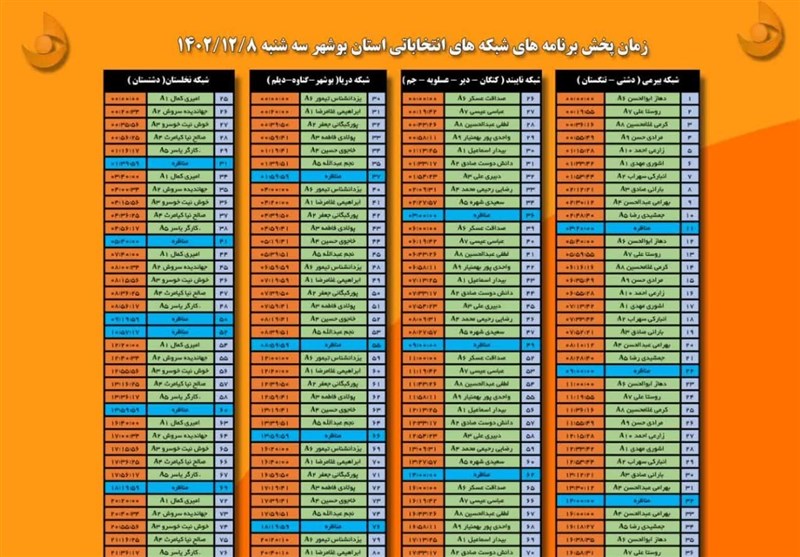 حیدری ادامه داد: ساعت 22:30 دقیقه مناظره کاندیداهای حوزه انتخابیه دشتی و تنگستان از شبکه بیرمی تعیین شده و از شبکه رادیو استان بوشهر کاندیداهای دشتستان ساعت 12:37 دقیقه، کنگان، دیر، و عسلویه ساعت 14:35 دقیقه، بوشهر، گناوه و دیلم ساعت 16:20 دقیقه و دشتی و تنگستان ساعت 22 پخش میشود.