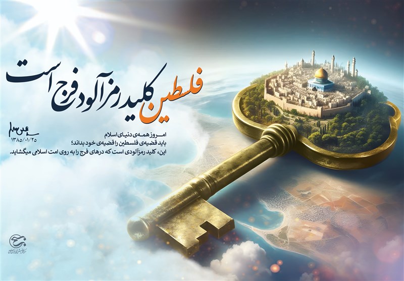 همچنین به خطِ ریزتری روی این پوستر از زبان امام خامنهای نوشته شده: امروز همهی دنیای اسلام باید قضیهی فلسطین را قضیهی خود بداند؛ این، کلیدِ رمزآلودی است که درهای فرج را به روی امت اسلامی میگشاید.
