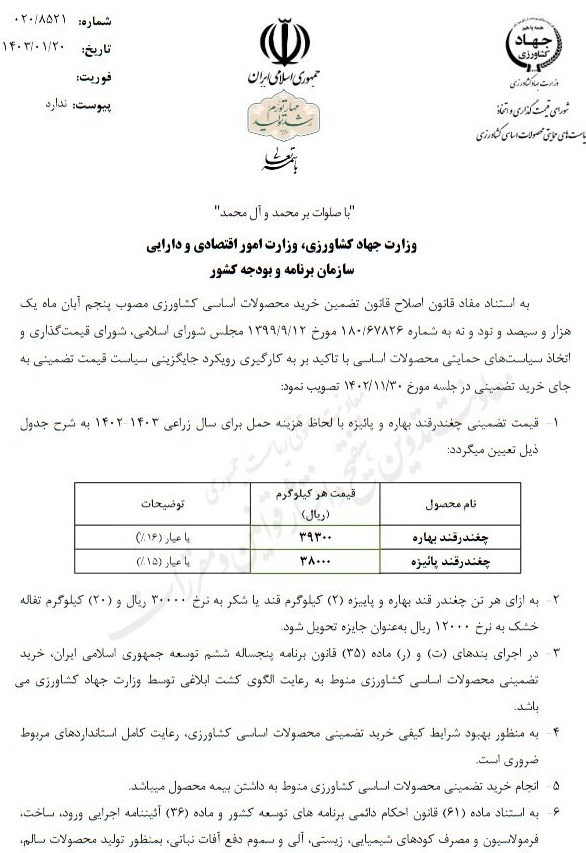به گزارش خبرگزاری تسنیم، شورای قیمتگذاری و اتخاذ سیاستهای حمایتی محصولات اساسی کشاورزی به استناد مفاد قانون اصلاح قانون تضمین خرید محصولات کشاورزی مصوب 1399 قیمت خرید تضمینی هر کیلوگرم چغندرقند بهاره عیار 16 درصد را 3 هزار و 930 تومان و برای هر کیلوگرم چغندرقند پاییزه عیار 15 درصد را 3 هزار و 800 تومان تعیین کرد.