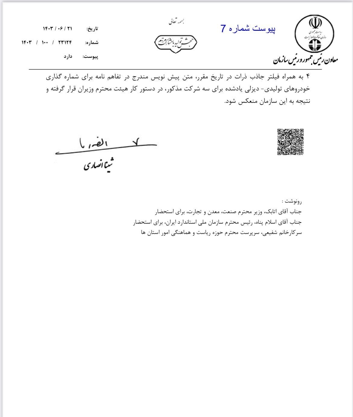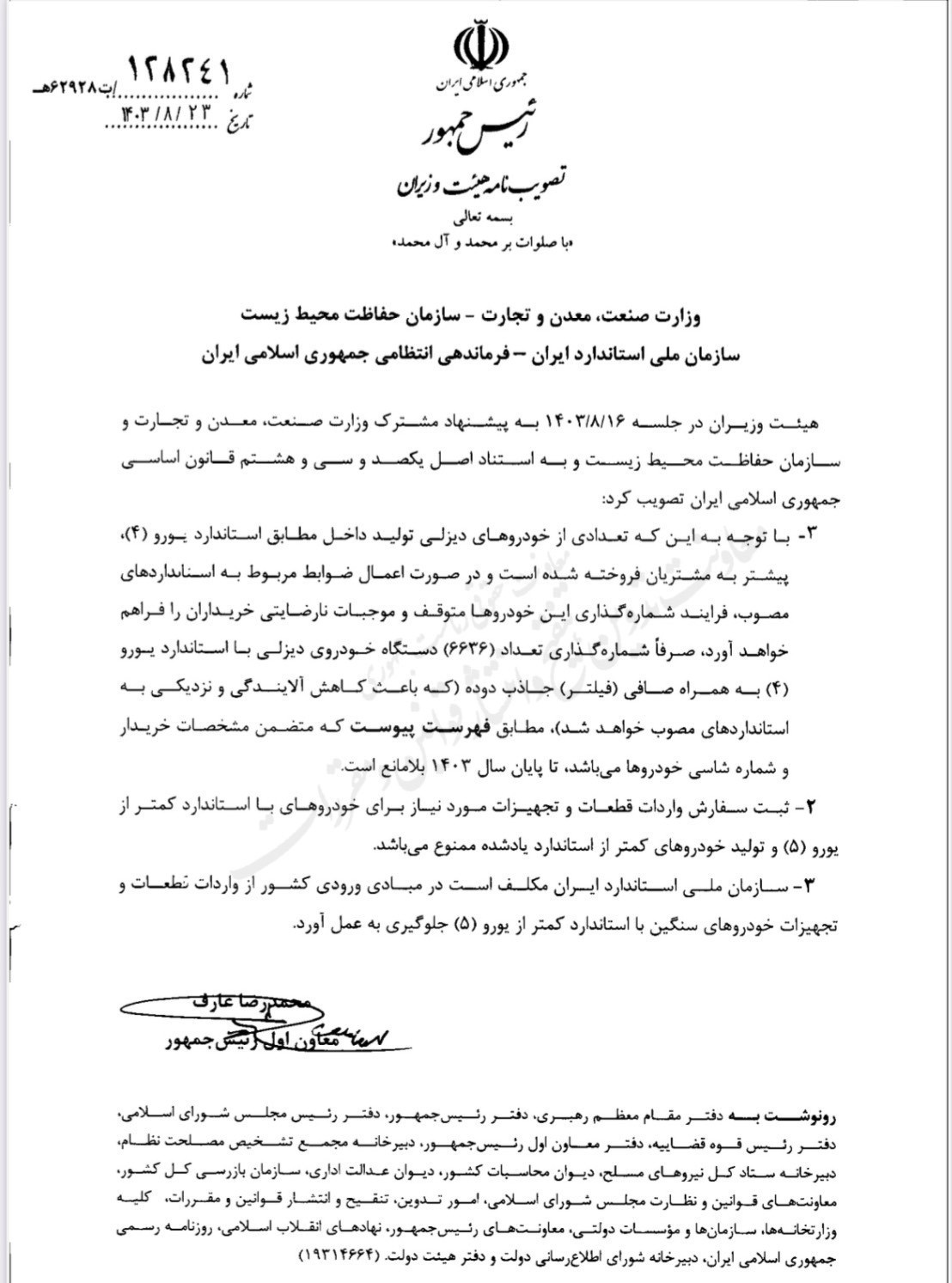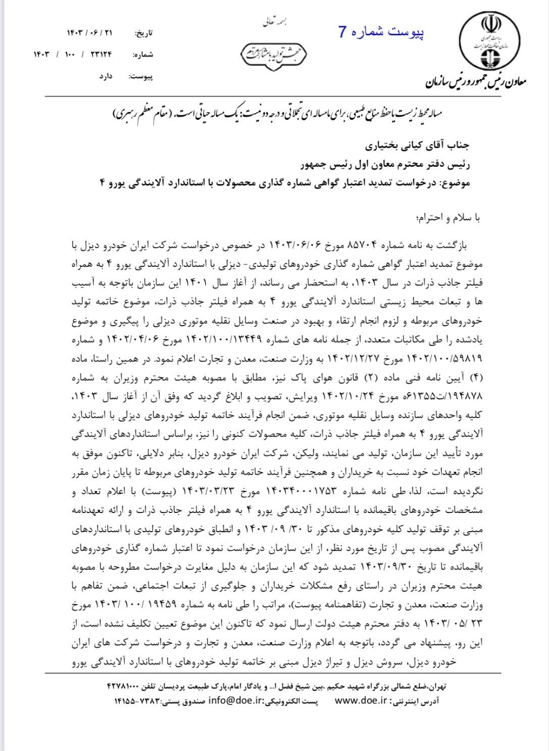 "با توجه به این که تعدادی از خودروهای دیزلی تولید داخل مطابق استاندارد یورو (4)، پیشتر به مشتریان فروخته شده است و در صورت اعمال ضوابط مربوط به استانداردهای مصوب فرایند شماره گذاری این خودروها متوقف و موجبات نارضایتی خریداران را فراهم خواهد آورد، صرفاً شماره گذاری تعداد (6636) دستگاه خودروی دیزلی با استاندارد یورو (4) به همراه صافی (فیلتر) جاذب دوده که باعث کاهش آلایندگی و نزدیکی به استانداردهای مصوب خواهد شد مطابق فهرست پیوست که متضمن مشخصات خریدار و شماره شاسی خودروها میباشد تا پایان سال 1403 بلامانع است."
