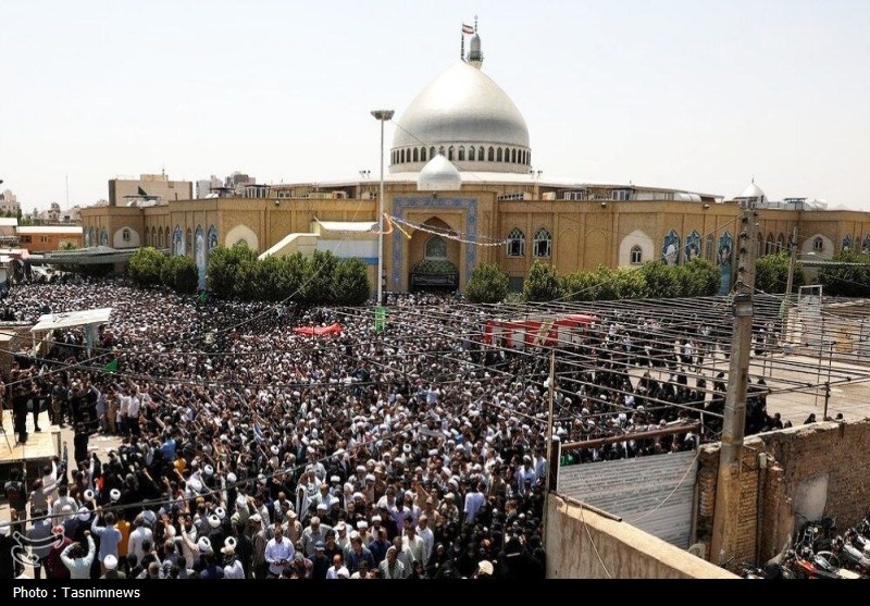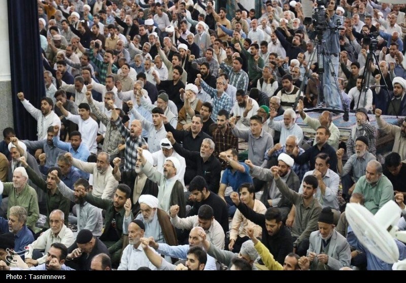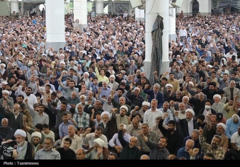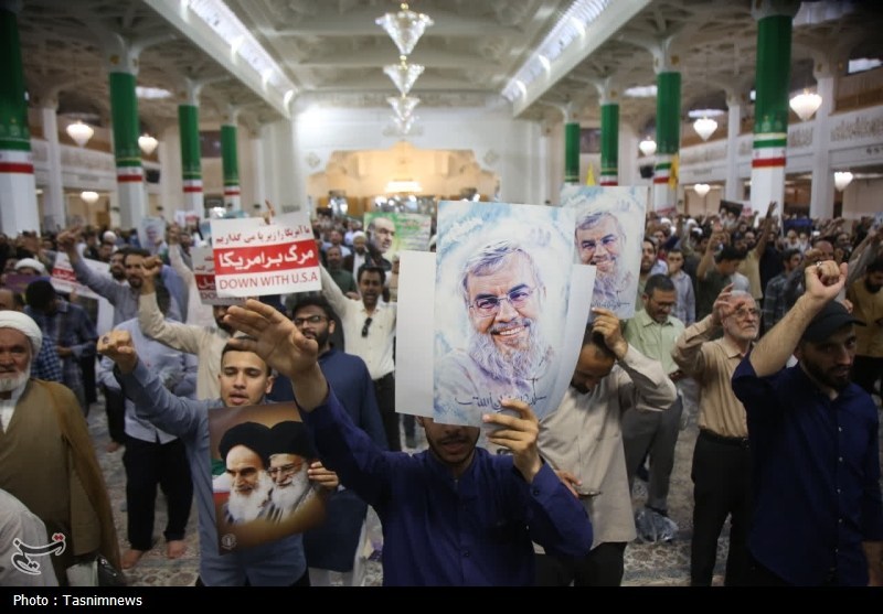 امواج جمعیت با پرچم‌های سرخ یا لثارات الحسین علیه السلام و پرچم ایران «طلب خون‌خواهی» کردند و مسیر نمازجمعه تا حرم را پیمودند و یکصدا خواهان پاسخی «قاطع» به جنایت اخیر رژیم صهیونیستی شدند.