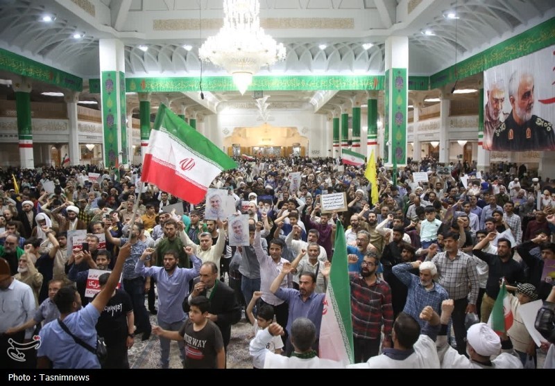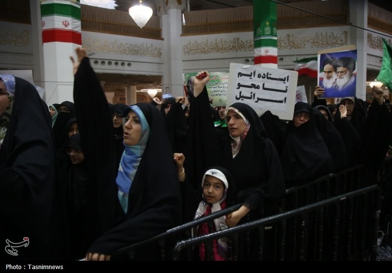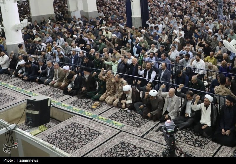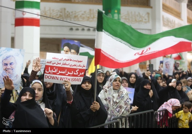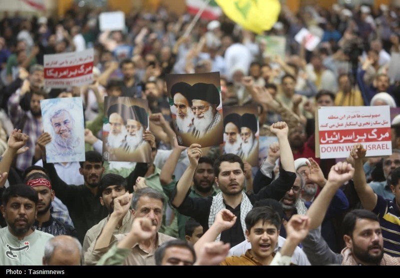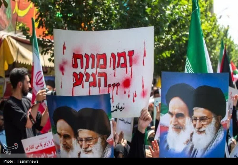 فریادهای «مرگ بر اسرائیل»، «انتقام قطعی است» و «ایستاده‌ایم تا محو اسرائیل» لحظه‌ای خاموش نشد؛ شعارهایی که در کنار «مرگ بر آمریکا» و «تا خون در رگ ماست، خامنه‌ای رهبر ماست» روحیه همبستگی و تبعیت را به رخ کشید.