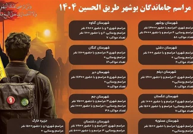 وی در پایان با اشاره به شهرستان‌های دارای بیشترین شرکت‌کننده افزود: شهرستان دیر با 16 هزار و 300 نفر، شهرستان بوشهر با 13 هزار نفر و شهرستان دشتستان با 7 هزار و 900 نفر بیشترین آمار حضور در راهپیمایی جاماندگان اربعین امسال استان را به خود اختصاص دادند.