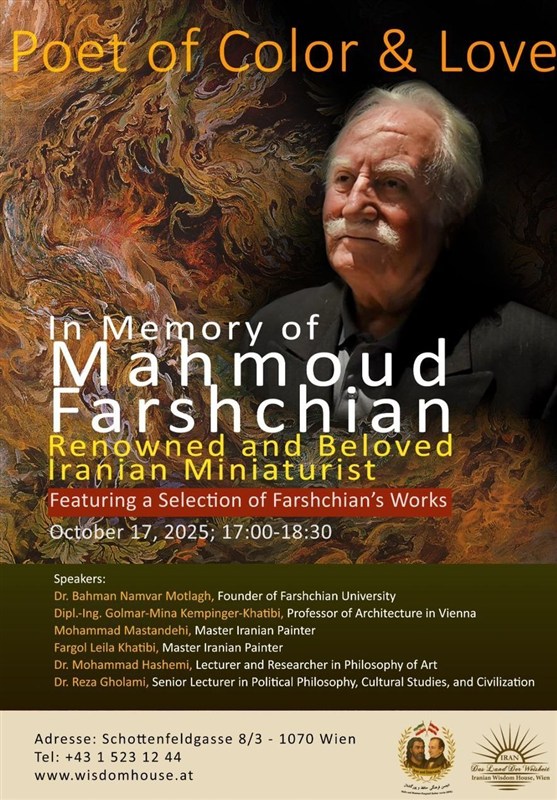 این مراسم جمعه 25 مهرماه 1404 برابر با 17 اکتبر 2025، ساعت 17:00 تا 18:30 در خانه فرهنگ ایران در وین، تالار ابن‌سینا برگزار می گردد. سخنرانان این مراسم دکتر بهمن نامور مطلق، بنیان‌گذار دانشگاه فرشچیان، پژوهشگر برجسته ادبیات و هنر ایرانی و استاد دانشگاه شهید بهشتی، دیپ اینگ گلمر، مینا کمپینگر خطیبی، استاد معماری در وین و متخصص در تلفیق هنر سنتی با معماری مدرن، محمد مستاندهی، استاد نقاش ایرانی، فرگل لیلا خطیبی، استاد نقاش ایرانی و پژوهشگر و‌ مدرس هنر، دکتر محمد هاشمی، مدرس و پژوهشگر فلسفه هنر و دکتر رضا غلامی، مدرس ارشد فلسفه سیاسی، مطالعات فرهنگی و تمدنی، و مدیر اجرایی خانه حکمت ایرانیان در وین هستند.