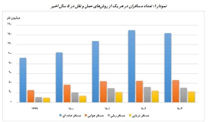 حمل و نقل آبی (دریایی):در سال 1403 حدود 23 میلیون نفر، مسافران ورودی و خروجی به بنادر کشور بودهاند که نسبت به سال قبل 6 درصد کاهش یافته است. همچنین میزان کالای تخلیه و بارگیریشده (نفتی و غیر نفتی) در بنادر کشور در همین سال به ترتیب بیش از 77 و حدود 176 میلیون تن بوده که نسبت به سال گذشته 4 و 3 درصد افزایش داشته است.