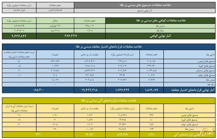 در قراردادهای اختیار معامله مبتنی بر طلا یک میلیون و 819 هزار و 77 قرارداد به ارزش 126 میلیارد تومان دادوستد شد.