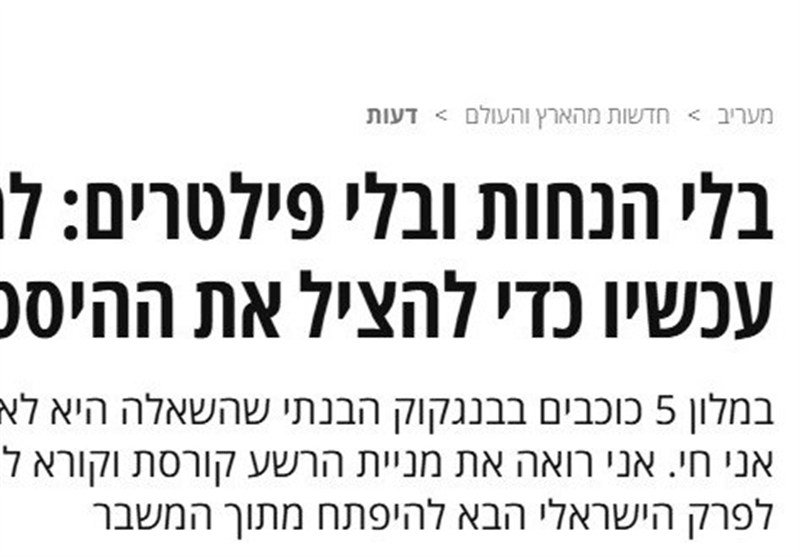 به گزارش گروه عبری خبرگزاری تسنیم، یائیر انسپاخر در یادداشتی که در شماره امروز این روزنامه عبری زبان منتشر شد، اعلام کرد، فرق نمیکند که من اکنون کجا نشستهام بلکه پرسش اصلی آن است که چه ماجرایی را زندگی میکنم، وقتی بازار سهام لعنتی را در حال فروپاشی مییابم و از نتانیاهو میخواهم تا برای خروج از بحران از قدرت کناره گیری کند.