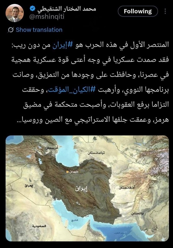 به گزارش خبرگزاری تسنیم، «محمد المختار الشنقیطی»، یک استاد دانشگاه و تحلیلگر سیاسی عربزبان نوشت: «برنده نخست این جنگ بدون تردید ایران است: از نظر نظامی در برابر قدرتمندترین نیروی نظامی عصر ما ایستادگی کرد، موجودیت خود را از فروپاشی حفظ کرد، برنامه هستهایاش را صیانت نمود، رژیم موقت (اسرائیل) را به هراس انداخت، تعهد به رفع تحریمها را به دست آورد، بر تنگه هرمز مسلط شد و اتحاد راهبردی خود با چین و روسیه را عمیقتر کرد.»