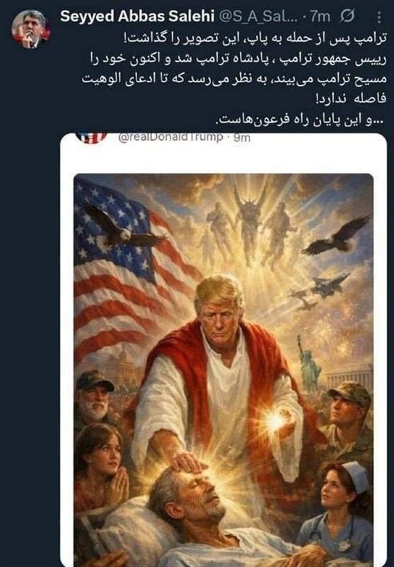 سیدعباس صالحی نوشت: «ترامپ پس از حمله به پاپ این تصویر را گذاشت. رئیس جمهور ترامپ، پادشاه ترامپ شد و اکنون خود را مسیح ترامپ می‌بیند. به نظر می‌رسد که تا ادعای الوهیت فاصله‌ای ندارد. و این پایان کار فرعون‌هاست...»