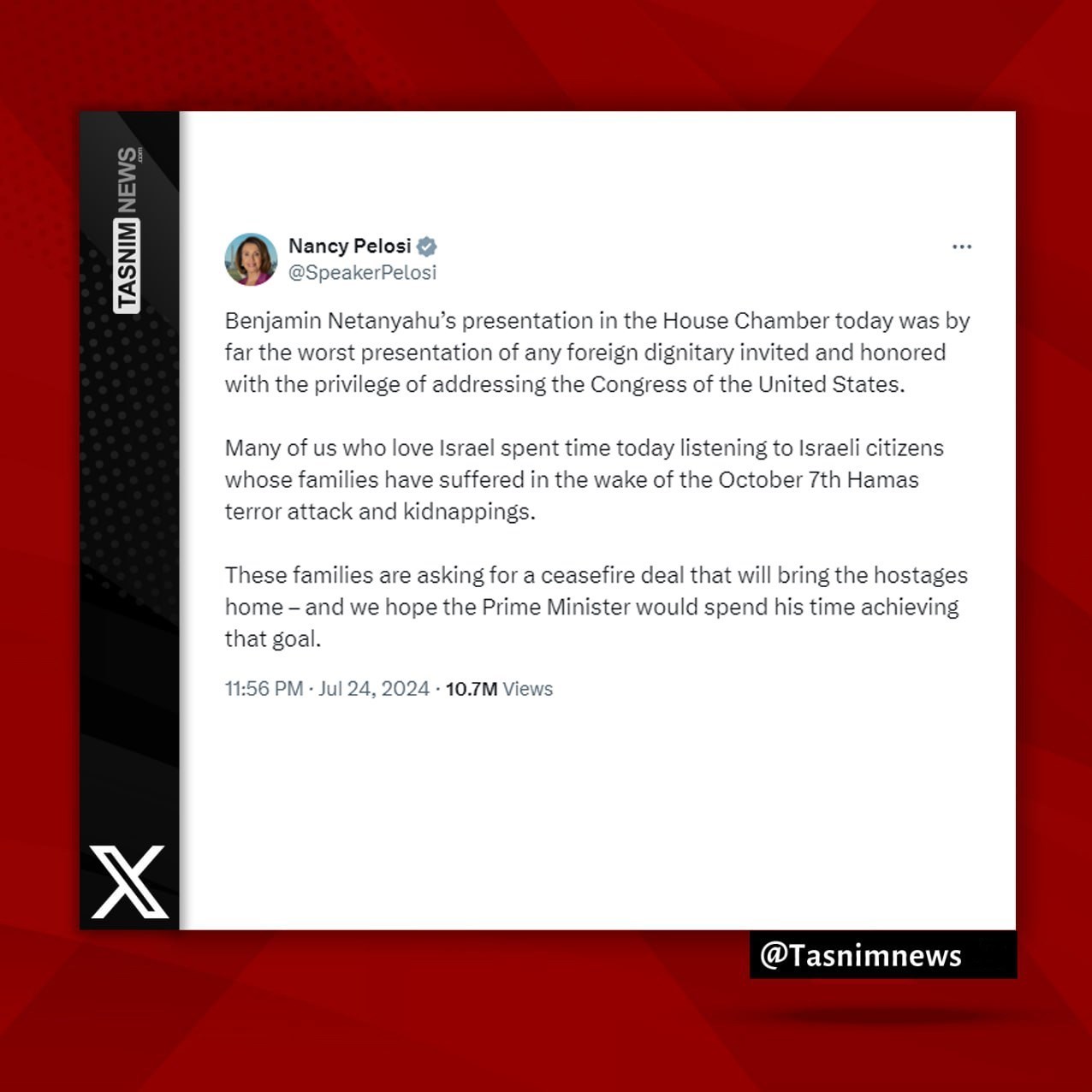 יו"ר בית הנבחרים לשעבר ננסי פלוסי, מהמנהיגות הבולטות במפלגה הדמוקרטית, תקפה את נאומו של ראש הממשלה בנימין נתניהו בקונגרס האמריקאי.פלוסי כתבה בחשבון ה-X שלה כי נאומו של נתניהו היה "ללא ספק ההצהרה הגרועה ביותר של מנהיג זר שהוזמן לנאום בקונגרס של ארצות הברית".