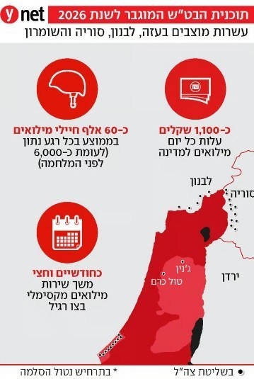 לכאורה בישראל המלחמה נגמרה, אבל הנטל נשאר: קרבות התקציב חושפים את התרחיש שאליו נערך צה"ל בשנה הבאה – המשך ההחזקה במוצבי "הקו הצהוב" בעזה, וגם בגולן הסורי ובדרום לבנון. לכן, לפי אתר החדשות הישראלי Ynet, כ-60 אלף חיילי מילואים ישרתו בכל רגע נתון ב-2026 - פי 10 מלפני 7/10 - וכל משרת ייקרא לחודשיים וחצי, פי 8. הרמטכ"ל דורש לקבע את סל הצרכים העצום הזה ל-5 שנים. הסעיפים שמאחורי ההיערכות לשנה הבאה חושפים את העומס שיימשך על גב המילואימניקים, ואת המציאות הביטחונית הכבדה עם נוכחות צה"לית נרחבת על הקרקע בכל הזירות ומשני עברי הגבול.